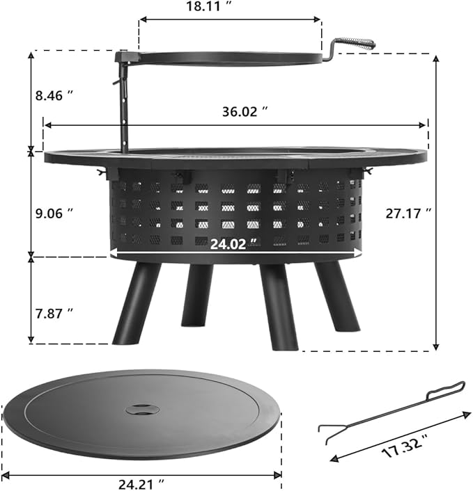 - đ„ăBeautiful & Humanized DesignăThe Verdeluxe outdoor fire pit is equipped with a height adjustable 360 ° rotating grill that can be freely disassembled.There is a circle of table panels next to the fire pit bowl.It can conveniently store cutlery and food.The cooking grill has four levels of height adjustment, which allows food to be cooked under appropriate heat and enjoy the delicious barbecue experience.
