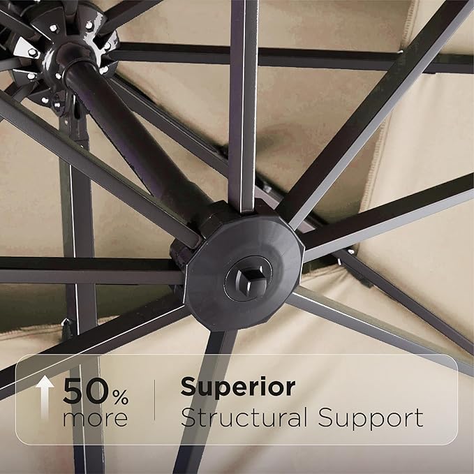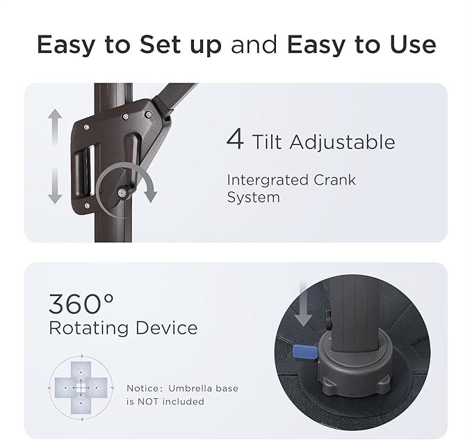 - Stable Frame: Patio umbrella base in the picture is not included; Cantilever patio umbrella made of 8 heavy-duty ribs, which are anti-oxidation spray painted and powder coated, not easy to oxidize and rust and can withstand long-term use; Let's start enjoying outdoor patio umbrella