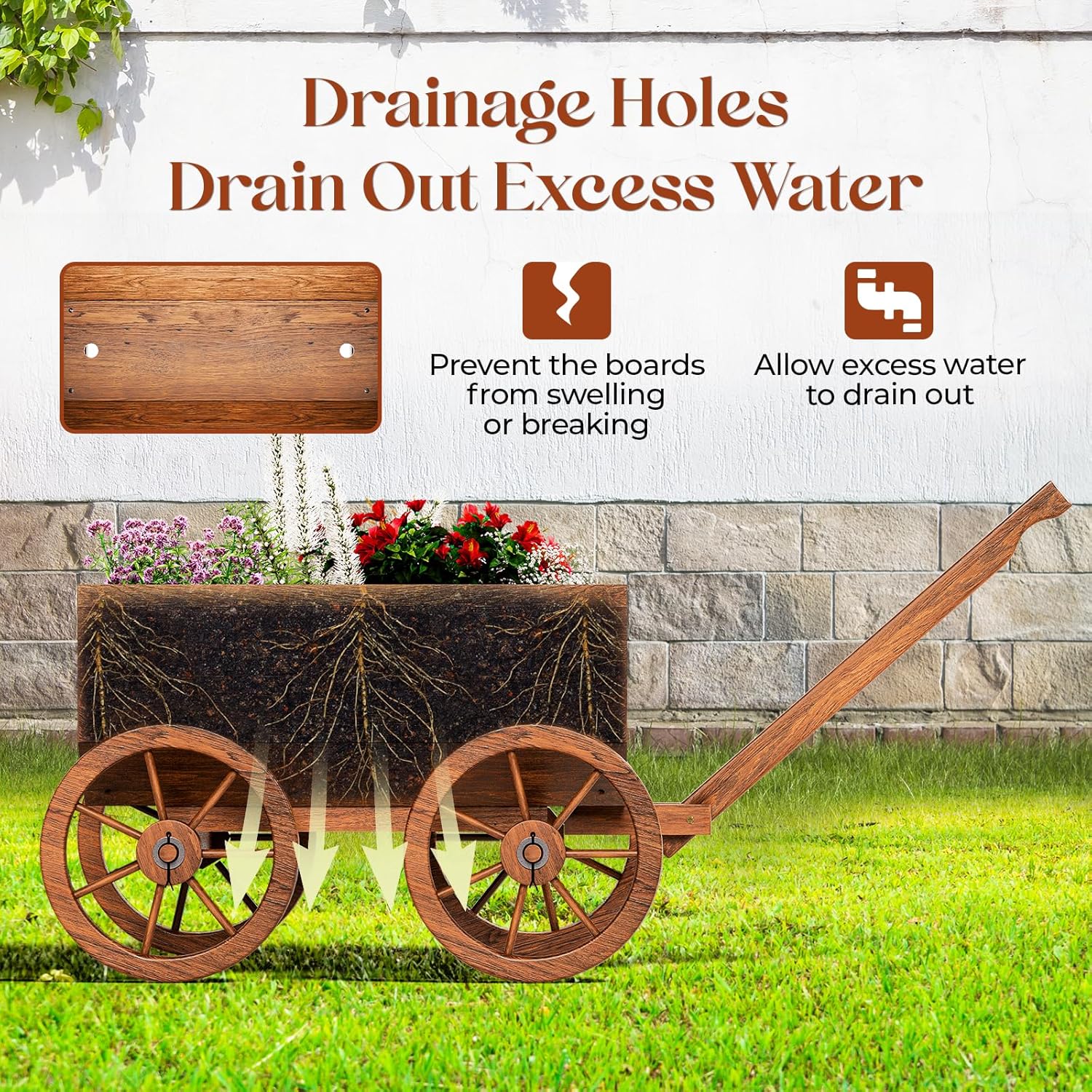 Wood Wagon Planter for Outdoor Balcony Decor - Garden Rustic Wooden Flower Cart with Wheels for Outside - Garden Decor - Amish Decorative Indoor - Wheelbarrow Planter for Patio