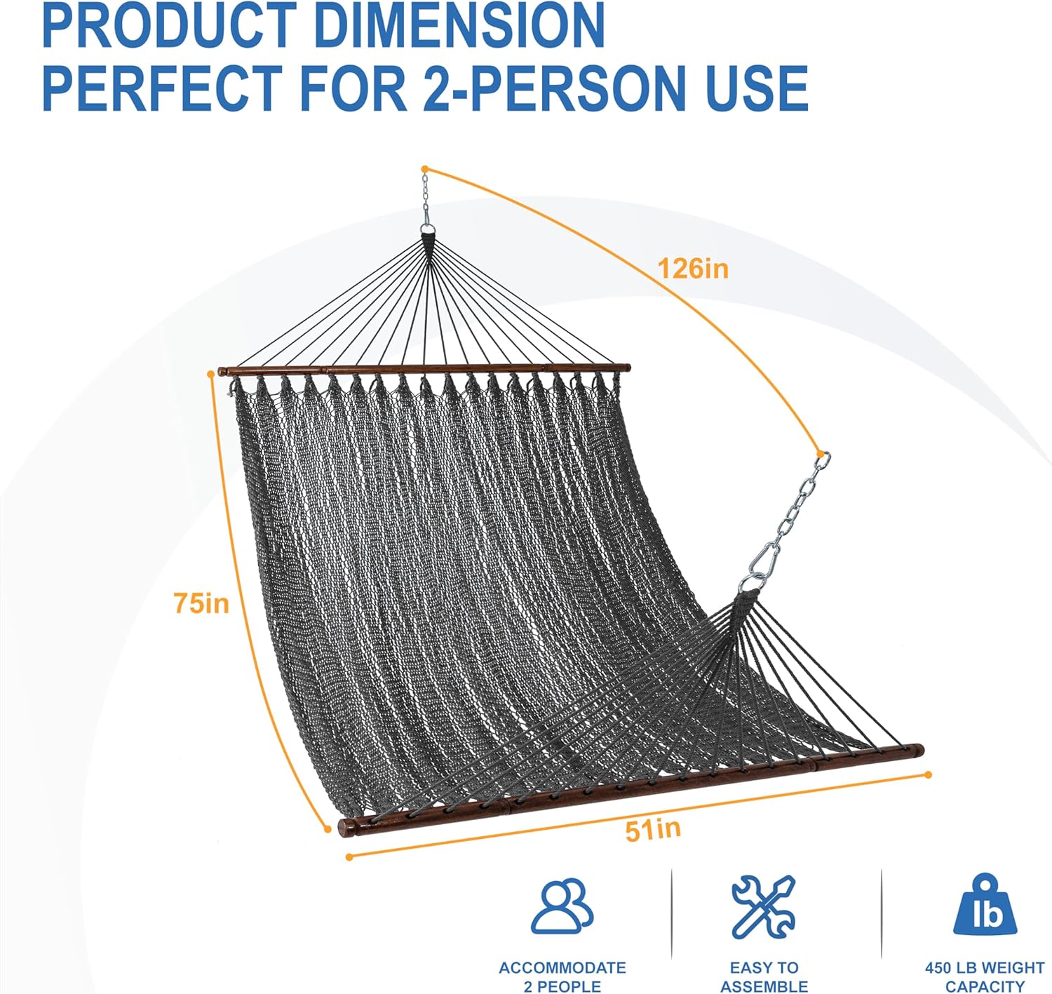 - Extra Large Hammock: Hammock bed dimensions: 75 x 51 inches, it provides plenty of room for you to spread out and relax; The weight capacity of the double hammock can reach to 450 pounds which allows 2 person to hanging in the hammock; It’s time to have one Lazy Daze Caribbean Hammock