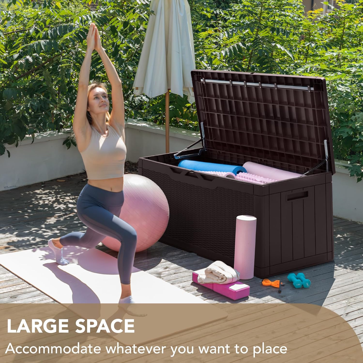 - Durable Resin Material: Deck box is made of waterproof resin, with a complementing rattan pattern design, effectively preventing fading and rusting, while also maintaining a fresh appearance even with all-weather use