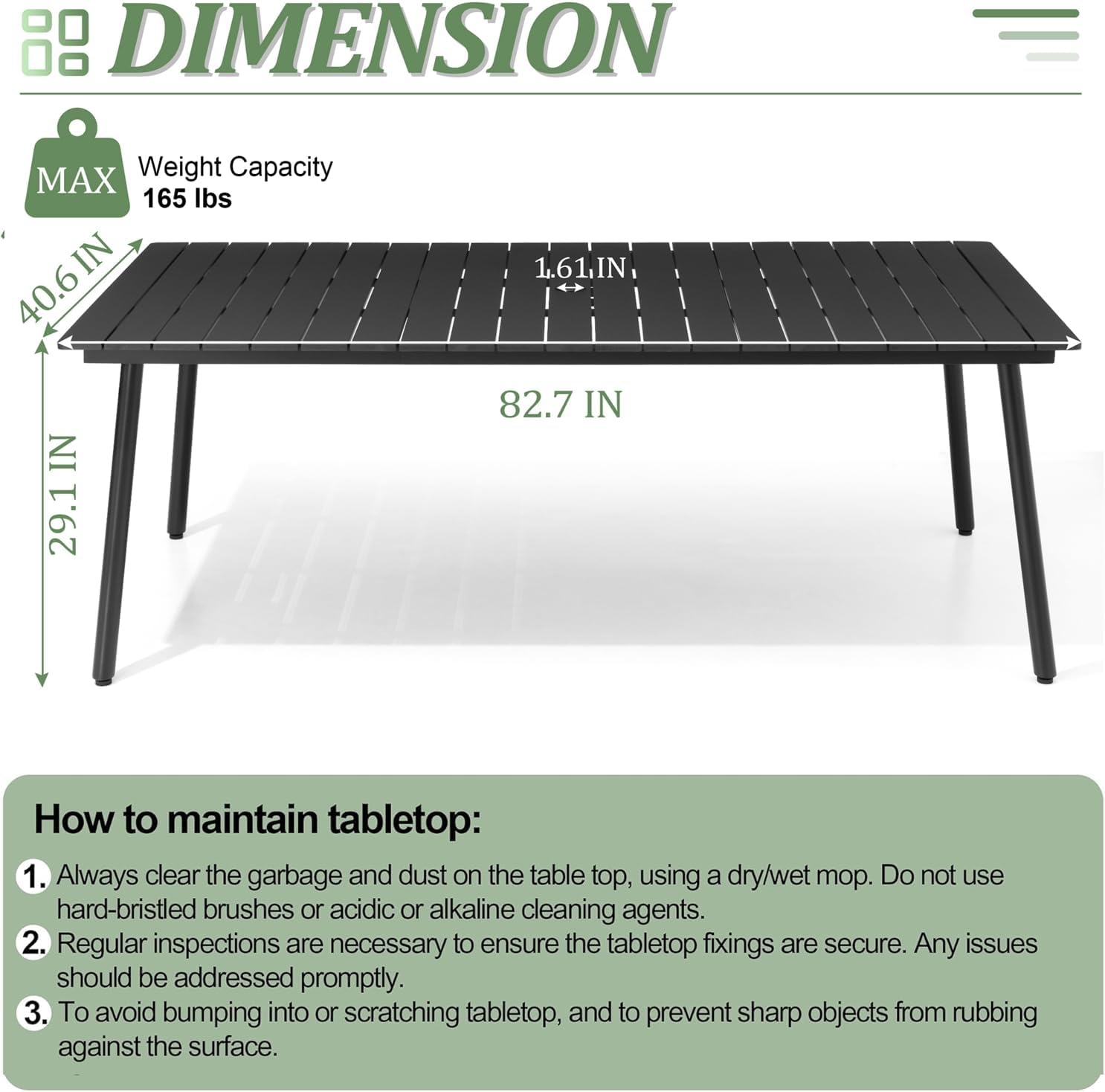- Dimensions: This dining table is 29.1"H x 82.7"W x 40.6"D; Top length: 6.89 FT. Weight Capacity: 165lbs. Due to its lightweight design, this outdoor dining table can be easily moved to any location.