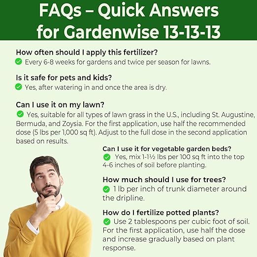 - šæ Balanced 13-13-13 Fertilizer for Outdoor Plants: Provides 13% Nitrogen, 13% Phosphorus, and 13% Potassium for optimal growth. Perfect for lawns, vegetable gardens, rose bushes, flowers, shrubs, and trees. Ideal for St. Augustine grass, evergreens, and all outdoor plants.