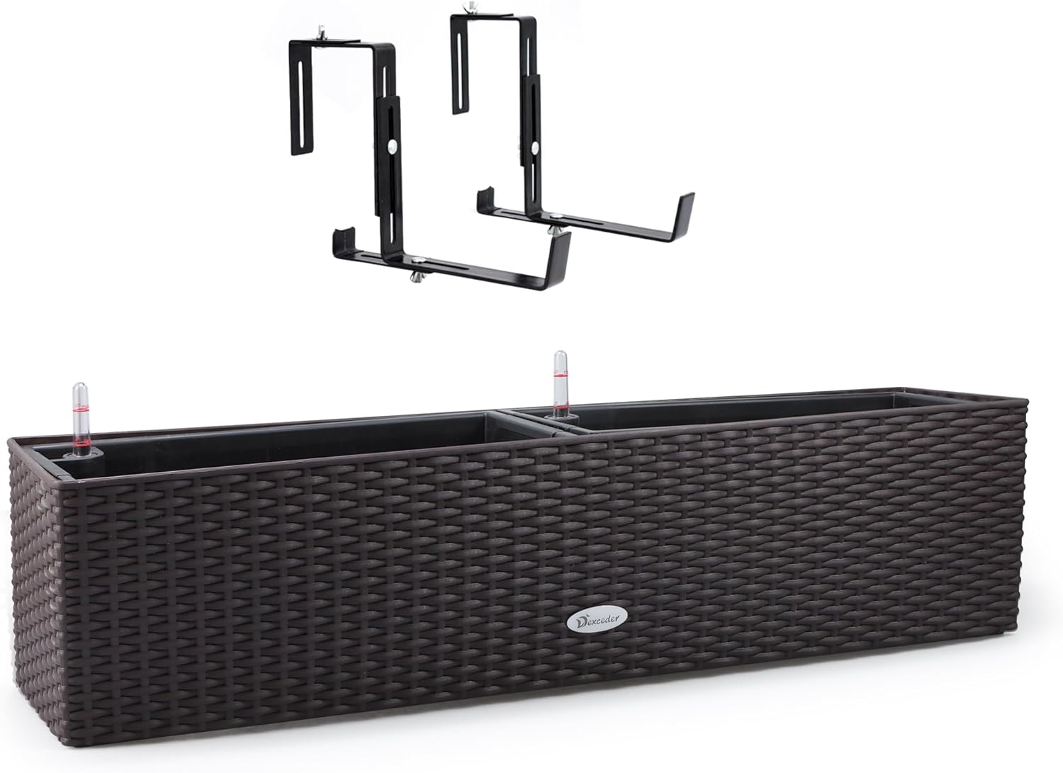 Dexceder 31.5 Inch Rattan Self Watering Planter Indoor Outdoor, Thickened Large Rail Flower Plant Pot Window Box with Water Level Indicators & Bracket (Brown)