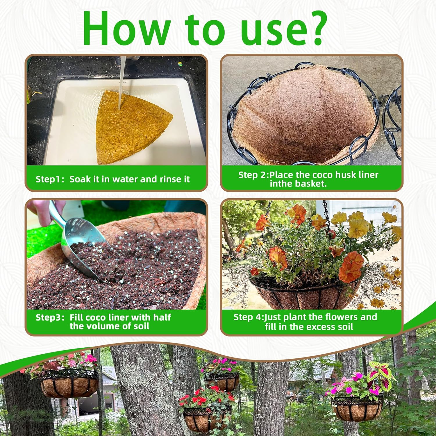- 🌹【Easy to Use】: These coconut fiber replacement liners are round. Before placing them in the container, soak them in water for a while to make them more pliable. Easily cut them with scissors to fit the size of your pot. Then, plant your flowers or plants in the soil and bury them, creating a beautiful garden decoration.