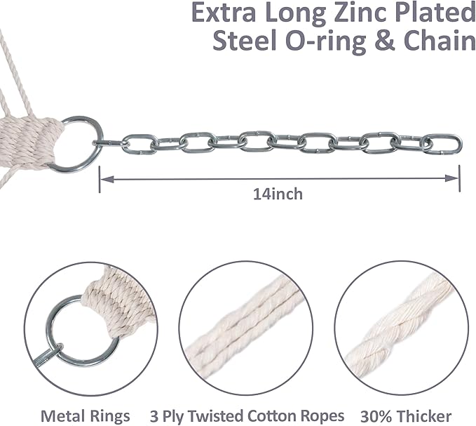 - Upgraded 30% Thicker Ropes: The upgraded strong poly-cotton ropes are hand-woven with comfortable, long-lasting threads woven by the hammock artisans, 30% thicker than before. The 20 ropes are collected together and woven into a triangle pattern which is pleasing to the eye. O-shaped steel ring attaches the ropes and the chain