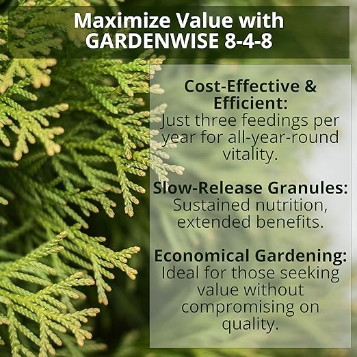 - šµ ECONOMICAL LONG-LASTING FORMULA: GARDENWISE 8-4-8 is not only cost-effective but also incredibly efficient, requiring just three feedings per year. Its slow-release granules ensure sustained nutrition and long-lasting benefits, making it an ideal choice for gardeners seeking an economical solution for maintaining their plants' health and vibrancy throughout the year.