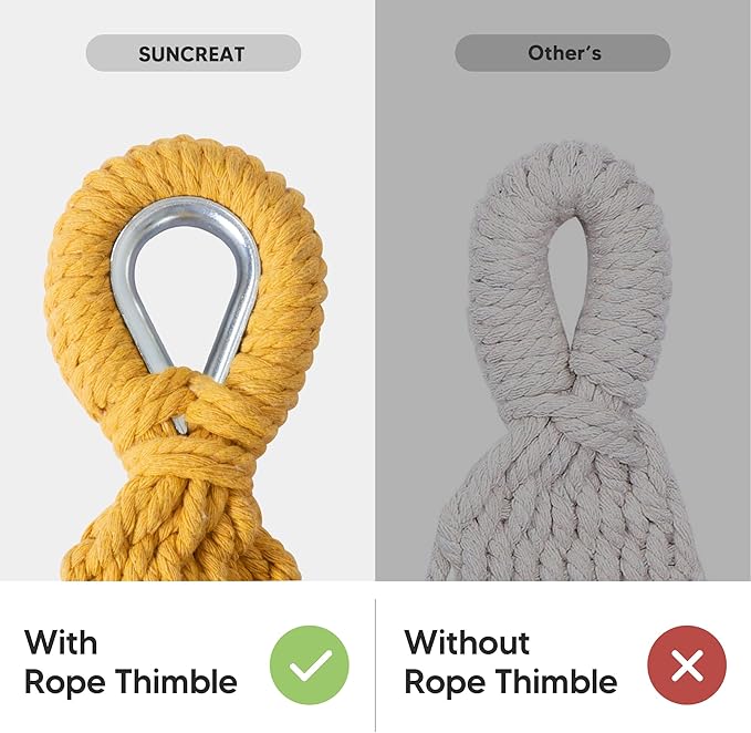 - Handcrafted Ropes: The metal rope thimble is effective for preventing the long-term friction between the tree strap and the ropes, thus prolong the service life of the hammock. The 18 ropes at both ends of the hammock are made of poly-cotton, tightly braided and fixed, which greatly increase the load bearing capacity