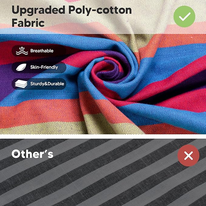 - Upgraded Fabric: Our Brazilian Camping hammock is made of eco-friendly thicker version poly-cotton fabric (no lint, no odor, not pilling, not fading, skin-friendly, and breathable), stronger and much more durable than ordinary fabric hammocks. A comfortable cocoon style hammock can keep you safe while enjoying the peaceful leisure time