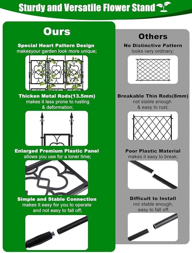 - š· 6.6FT Growing Paradise For Plants: This garden trellis set adopts heart-shaped grid design, more climbing space available to provide a freer growing environment for plants. With anti-corrosion design, no need to worry about rusting in the rain.