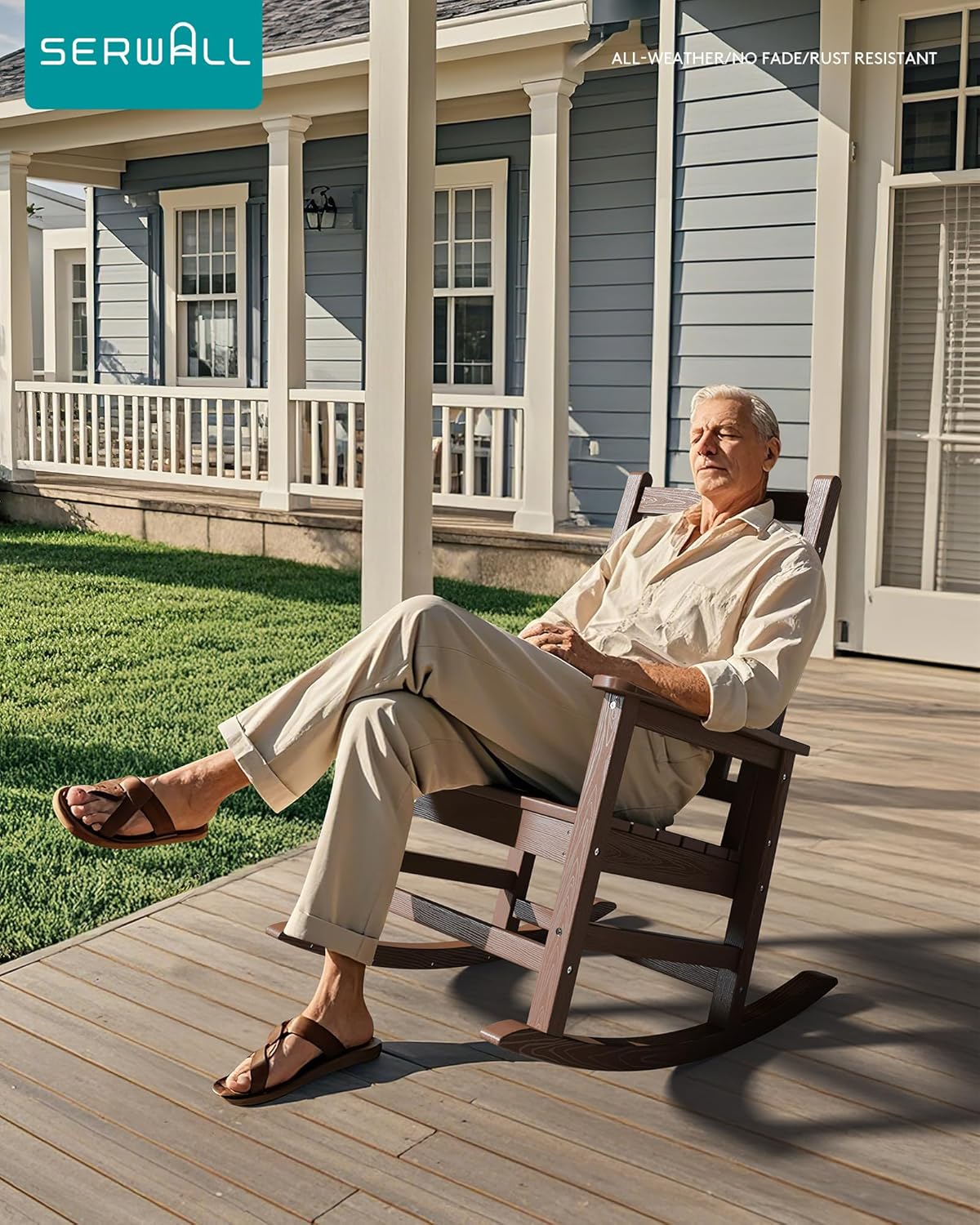 - Indoor & Outdoor Use: The wood-grain HDPE design transitions seamlessly between indoor and outdoor spaces, making this stylish outdoor rocking chair perfect for patios or living rooms.