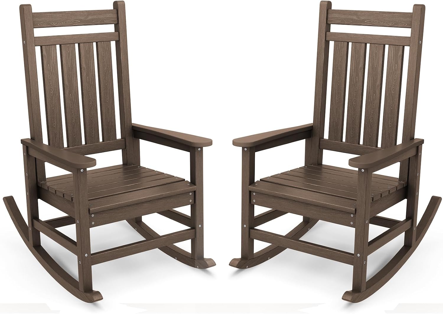 SERWALL Outdoor Rocking Chair Set of 2, HDPE Rocking Chairs for Adult, All Weather Porch Rockers for Lawn Garden, Coffee