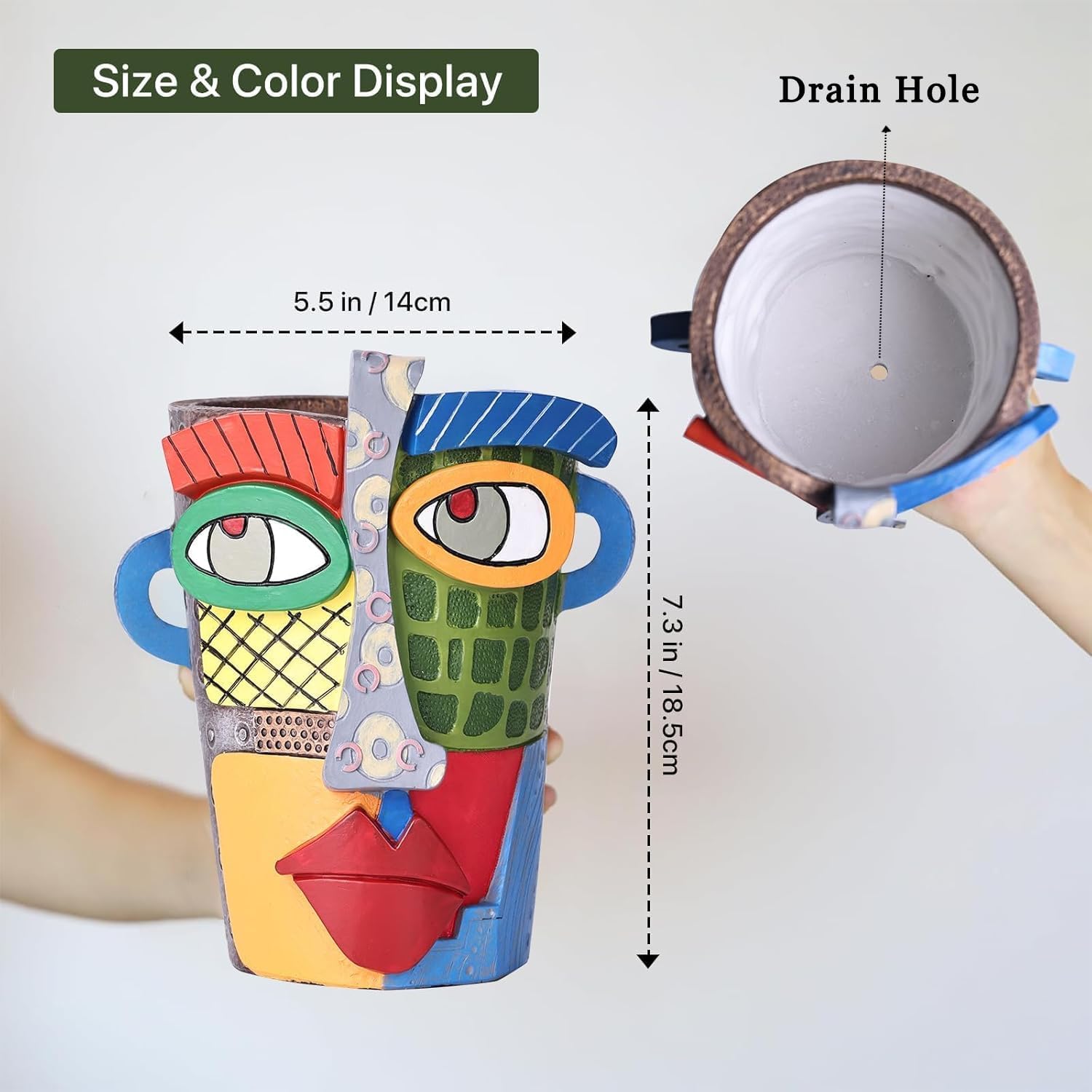 - This planter is made of resin and is colorful and a worthy planter.Every single eclectic head flower pot is hand painted unique. Crafted with attention to detail, our funny plant pots are made from high-quality materials ensuring durability and longevity. They are suitable for both indoor and outdoor use, making them versatile options for every plant lover.