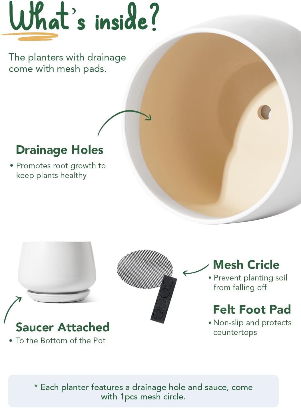 - Thoughtful Accessories: Our planters for indoor plants include saucer and drainage hole net, giving you full control; Let roots enjoy moisture while avoiding excess water; The mesh pad prevents soil from falling out, while the tray catches excess water (Tray and pot cannot be separated)