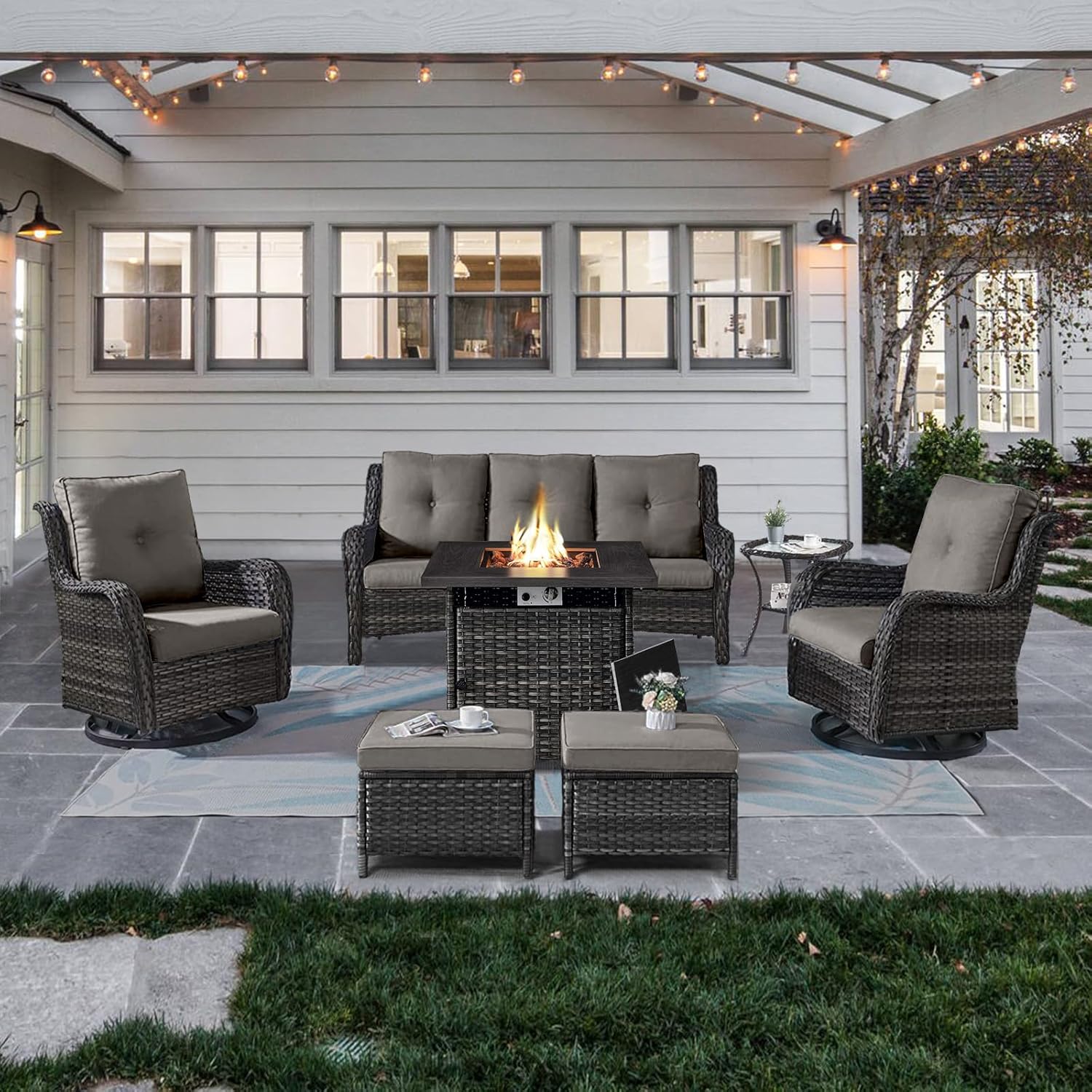 Outdoor Patio Furniture Set with Propane Fire Pit Table, 7 Pieces Wicker Patio Conversation Set with 2 Swivel Glider Rocker Chair Rattan Sofa Grey Cushion Perfect for Casual Gathering