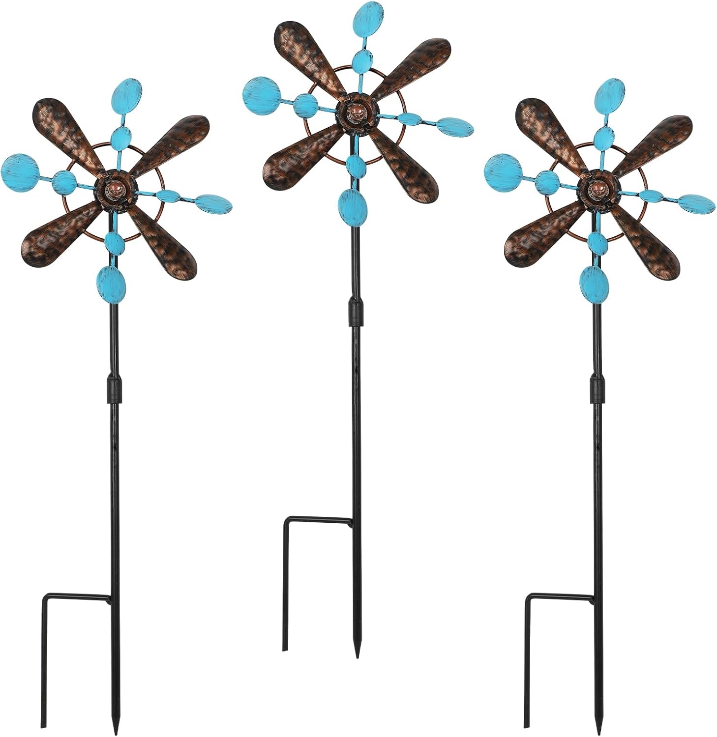 - 3 PACK Wind Spinners - Aoutrow Wind Spinner features 4 retro bronze blades and 4 bright blue blades. With premium low friction bearings design, it can rotate 360 degree while wind breezes. Bright color and amazing design create a visual sensation in your garden.