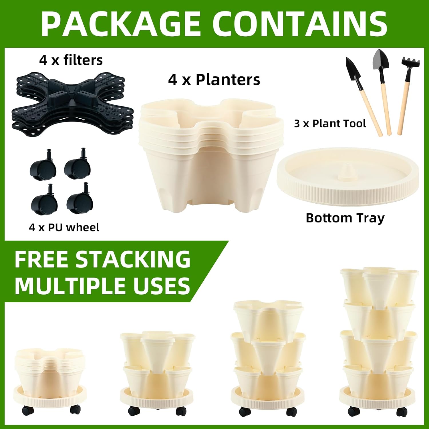- Full Accessory Set: You will get 4 pieces of stackable planter vertical garden, come with 1 set of planting tools accessories, and 1 piece of tray with wheels, easy and convenient assembly