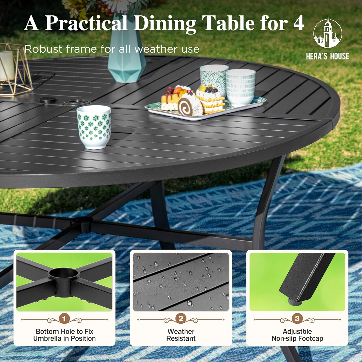 - 【42" x 28" METAL TABLE WITH 1.57" UMBRELLA HOLE】 HERA'S HOUSE slatted metal table top leaves enough water seepage gaps, which is easy to clean and won’t accumulate water. The center pre-cut hole allows you to add an umbrella to protect you and your family from UV damage. φ1.57" suitable for most umbrella in the market.
