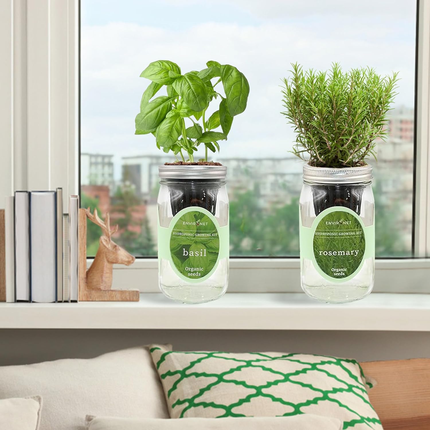 2-Pack Hydroponic Mason Jar Herb Garden Kit, Indoor Herb Garden Self-Watering Starter Kit (Basil,Rosemary)