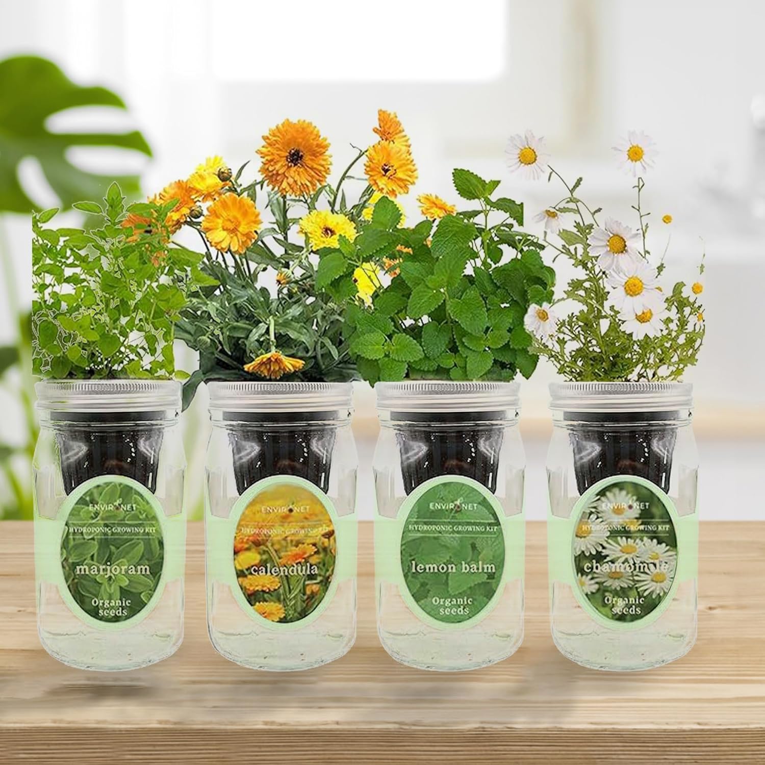 Hydroponic Herb Growing Kit Set, Self-Watering Mason Jar Herb Garden Starter Kit Indoor, Grow 4 Kinds of Herbs from Seeds (Calendula,Chamomile,Lemon Balm&Marjoram)