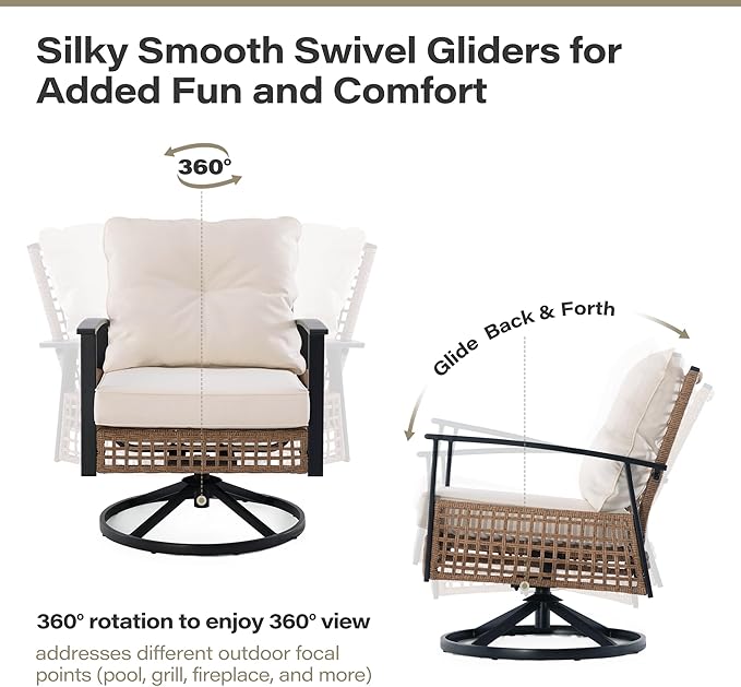 - 【High-Quality Materials】Constructed with high-quality galvanized steel pipes, the frame of the outdoor swivel chair delivers strong rust and fade resistance. The chair also uses wider rattan—more durable than ordinary rattan—while its polyester fabric features water repellency and superior abrasion resistance. This ensures the patio furniture set works well in various outdoor settings, including gardens, patios, and porches.
