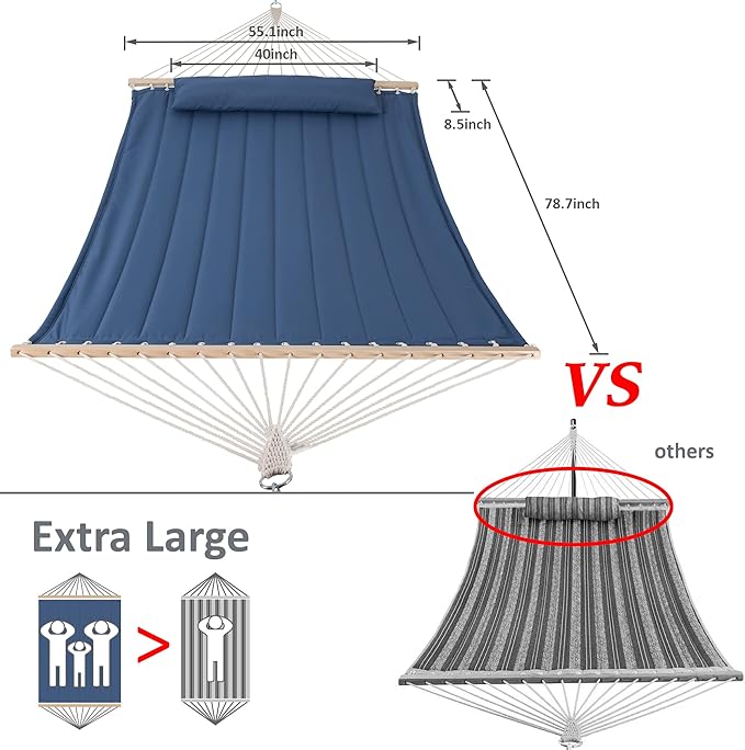 - Comfortable and Non-fading: Two-layer quilted polyester fabric with poly fiber filling which is cozier, best for camping and outdoor activities. Compared with other quilted hammocks, it will not fade after long-term usage. A polyethylene-stuffed head pillow offers superior comfort