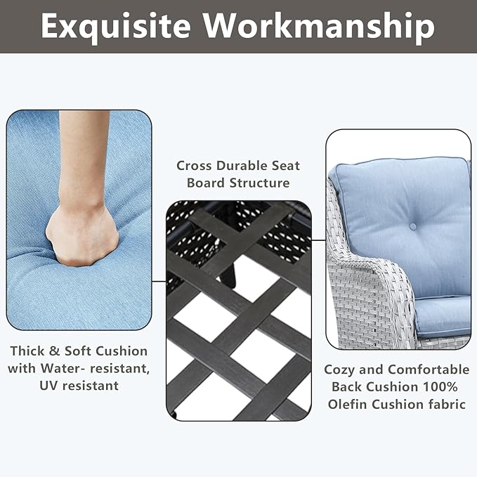 - 【Deep Seating & Comfort Cushions】This garden furniture set features deep and wide seats with 4-inch thick sponge-padded cushions.The cushions offers good resilience,not easy to deform or slide,also protect your lumbar and offer a comfortable sitting experience.