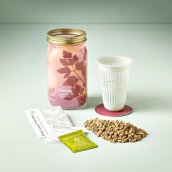 - Stylish & Functional Design: This thoughtfully designed kit features a durable mason jar with a removable sleeve - both made of recyclable materials, combining aesthetics and functionality for modern indoor gardening; It offers a minimalist growing experience that complements any living room shelf, bedside table, or sunroom nook - perfect for growing fresh parsley indoors with ease and style