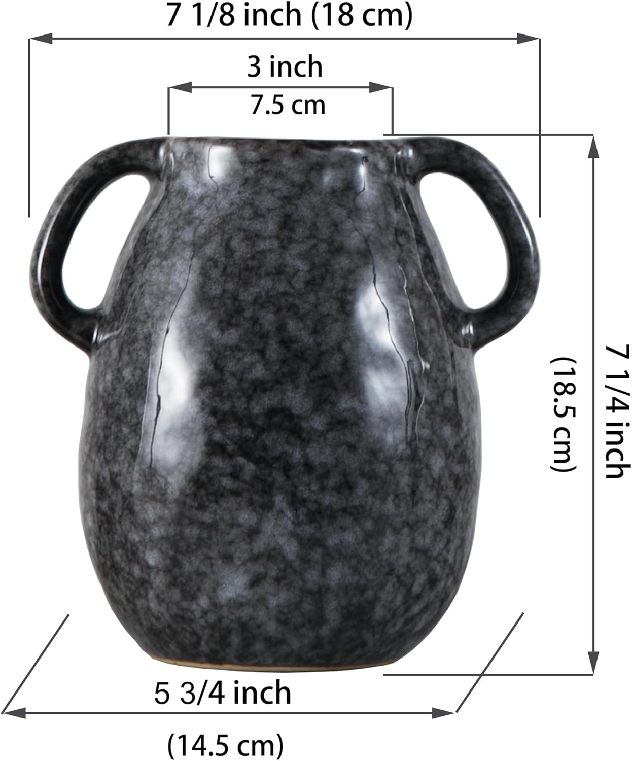 - Decorative Vase - The rustic ceramic vase made of high quality ceramic with special creative glaze finish, makes the vase looks soft and elegant. The unique design of the two handles is convenient for us to carry the vase. Size : 7 1/8"L x 5 3/4"W x 7 1/4"H with a 3"opening.