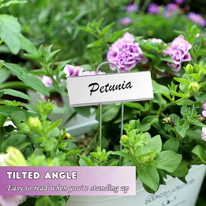 - ♥ Stable Two-Foot & Tilted Angle: The stable 2-foot design of the plant label stakes are simple to insert into the soil and will stay put for years to come. The slightly sloping angle makes it easy to read when you're standing up, it really helps to remind you what's the where.
