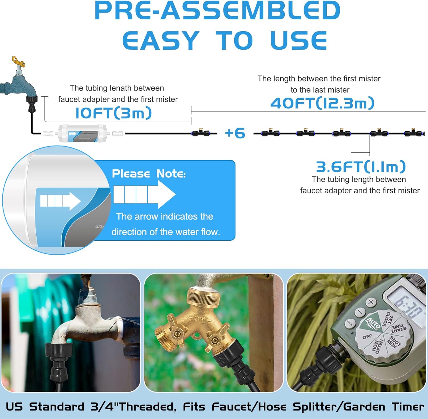 - EASY TO INSTALL - This misting system is completely pre-assembled, our US standard 3/4" adapter widely adapted to garden connectors, outdoor faucets, hose diverter, etc. Just connect it to the faucet and it works. Accessories and user manuals available, your misting ideas can be realized in just a few minutes.