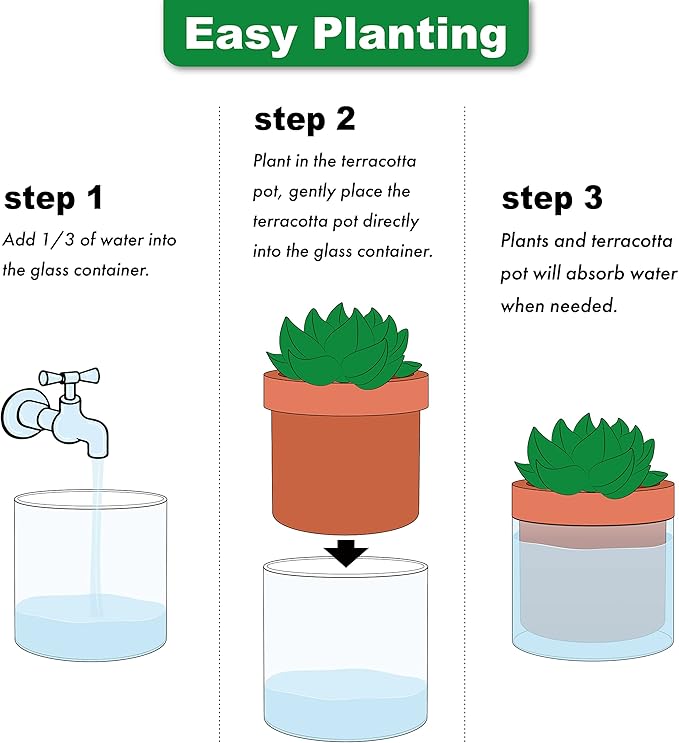- Self-watering System: The terracotta pot is unglazed, just fill the glass container with water to ensure plants will absorb only what they need through the terracotta pot walls.