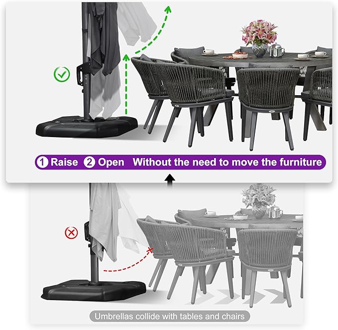 - Five-level Adjustment & 360° Rotation: The crank system of this cantilever umbrella makes it easy to raise and lower the canopy, the unique handle design also makes tilting the patio umbrella effortless, foot pedal allows for complete 360 degree rotation
