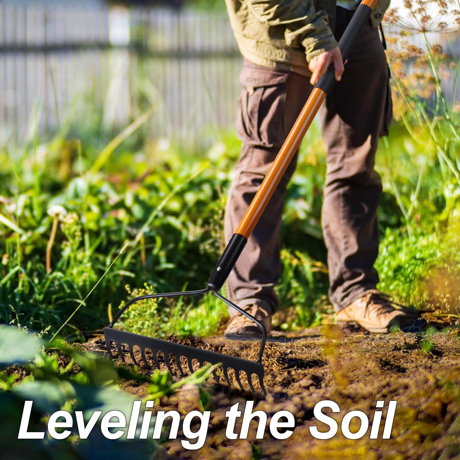 - 14 Tines Bow Rake: The bow rake with 14 sharp steel teeth can easily cut through the soil, and the wide bow rake head design can greatly improve gardening efficiency.