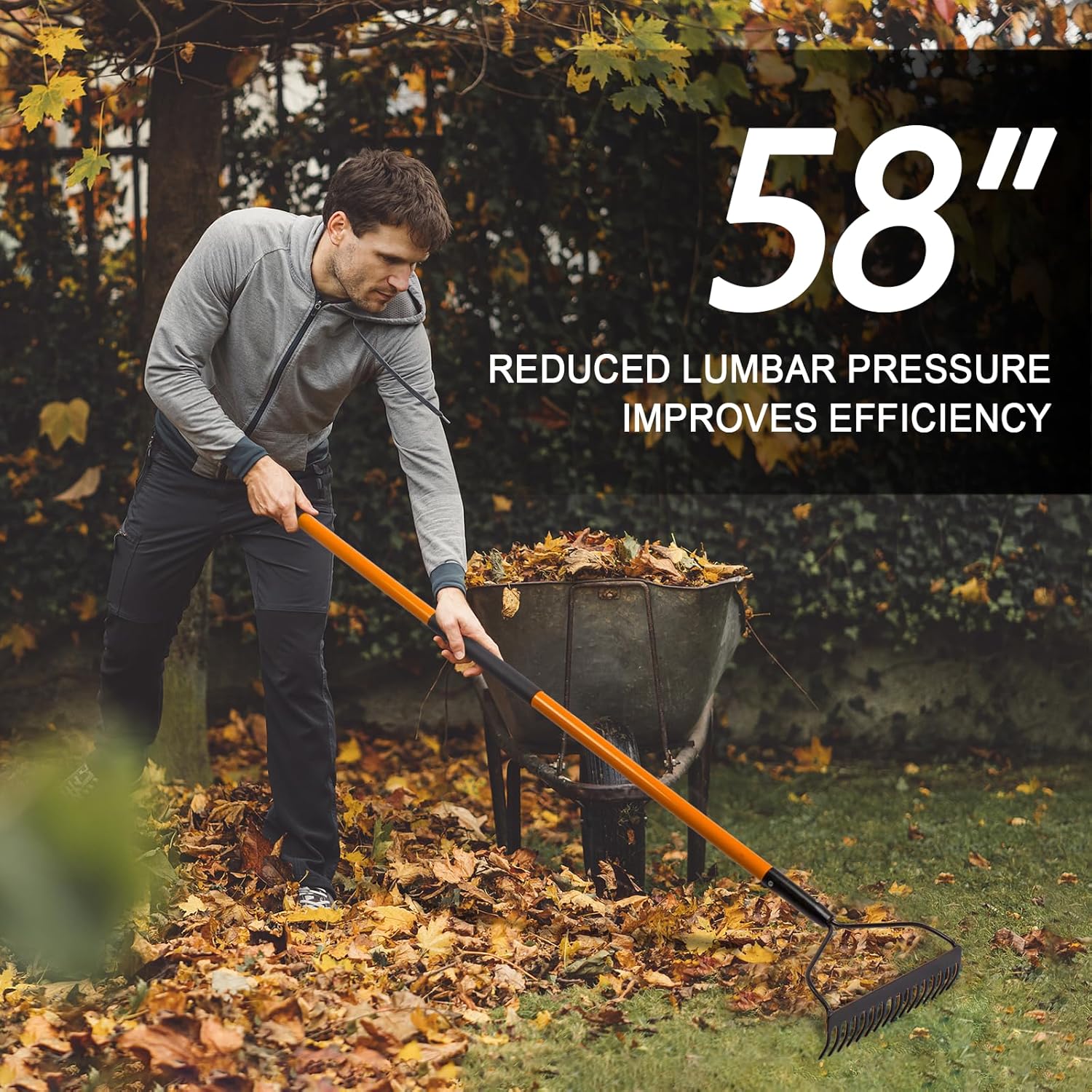 Garden Rake for Gardening, Heavy Duty Garden Rake for Lawns, 14 Tines Bow Rake with Fiberglass Handle, 58 Inches