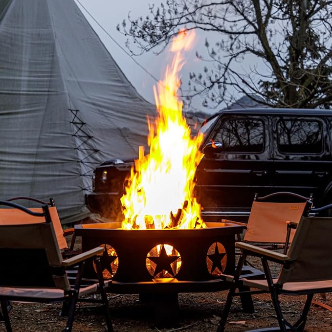 - [Beautiful & Safe Design] Panovue fire pit is unique octagon which is complement to any style yard. Wood fire pit for outside are coated with high-temperature powder for durability and rust resistance. Firepit has 4 sturdy legs and enough weight can improve stability on uneven ground. The mesh screen has beautiful star pattern which catches firelight for creating fun shadows, also it can avoid sparks and embers from flying out. Fire poker lets you to move wood safely.