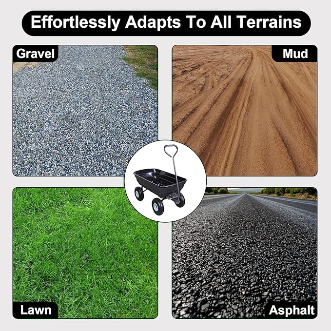 - 10" Pneumatic Plastic Tires : The garden wheelbarrow is equipped with 10" Pneumatic Plastic Tires,ensure durability and usability, with a larger force area for better grip and friction, smooth steering, and a large ground clearance to ensure that the garden wheelbarrow is able to adapt to a wide range of road conditions such as grass, snow, beach, and mud.