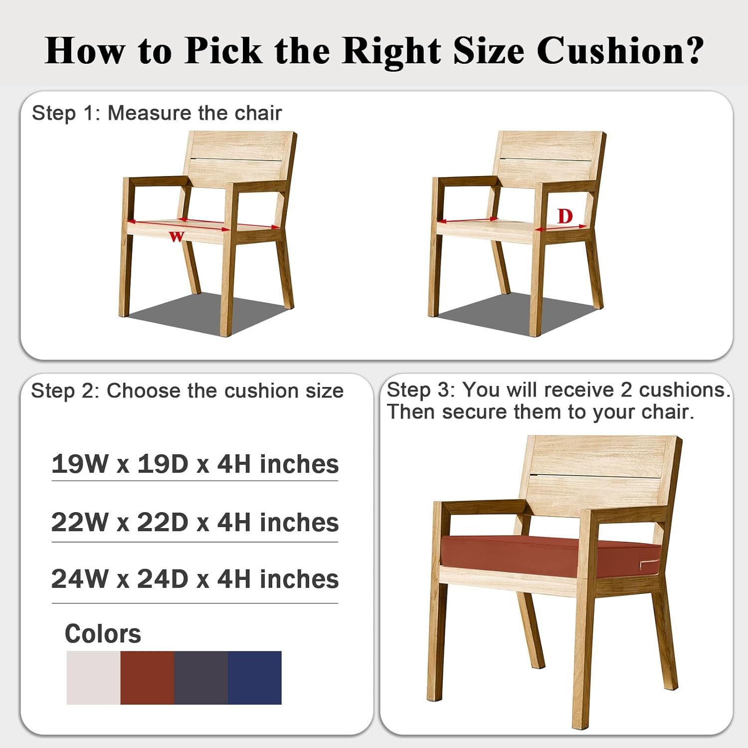 - PERFECT SIZE: Outdoor chair cushion set includes 2 cushions. Cushions measure: 22 inch (W) 22 inch (D) 4 inch (H). Fits most standard size outdoor chairs. Since the outdoor cushions are vacuum-packed, it may take 24-54 hours for the cushion foam to fluff back up after opening the vacuum bag