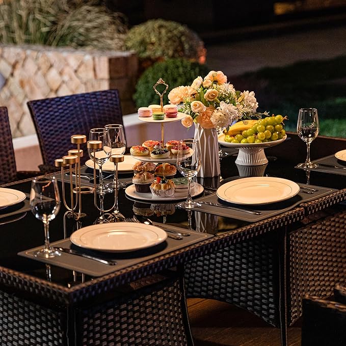 - Tempered Glass Tabletop: The dining table is made of high-quality tempered glass and equipped with a glass protection pad on the bottom, which is more wear-resistant than ordinary glass and easy to clean. The center of the glass is left with a 1.5-inch umbrella hole for a parasol, allowing you to enjoy a shady outdoor dining environment even on hot summer days