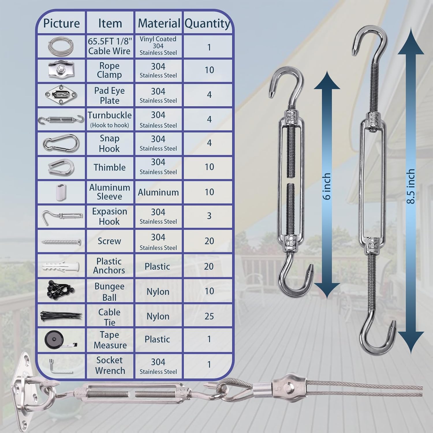 - 【Package Included】:Total 123PCS ,Included 1 x 65.5FT 1/8" Vinyl Coated Stainless Steel Cable Wire ; 4 x M6 Pad Eye ; 4 xM6 Turnbuckle; 4 xM6 Snap Hook ;10 x M5 Rope Clamp ; 10 xM3 thimble ; 10 xM3 aluminum sleeve ; 3 xM6 expansion hooks; ; 20 xScrew; 20 xplastic anchors;10 xBungee ball;25 xNyln cable Ties;1 xSocket wrench;1 xTape Measure .