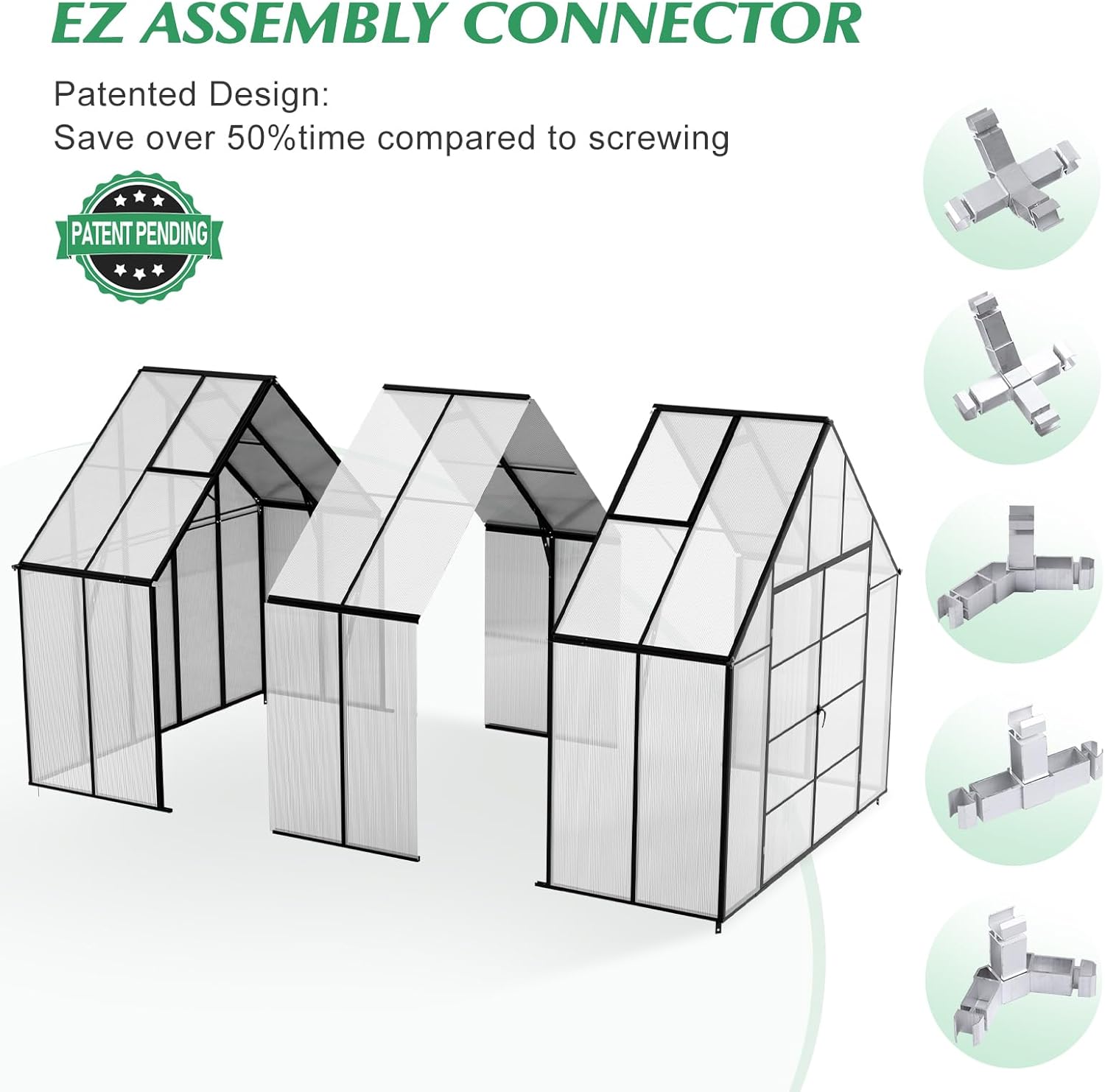 - š»ćQuick & Easy AssemblyćOur upgraded polycarbonate greenhouse designed with quick-fit connectors,adults can complete the installation within 4 hours. This greenhouse with modular design can be put together directly, the parts to be very precisely machined and they all fit together perfectly including where the holes were drilled.
