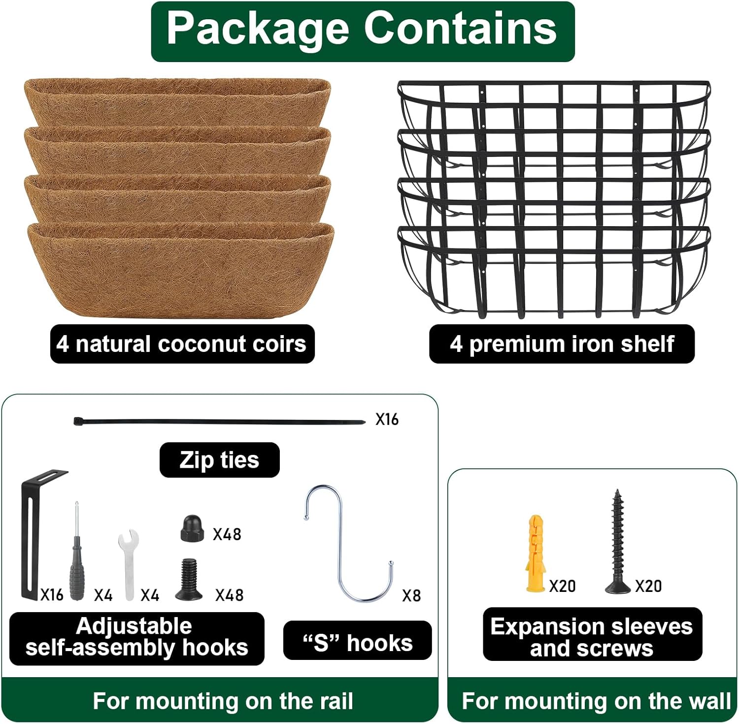 DUNCHATY Railing Planter Window Box - 4 Pack 24" Horse Trough Planter with Coco Fiber Liner - Deck Balcony Rail Planter for Porch Fence Patio Outdoor