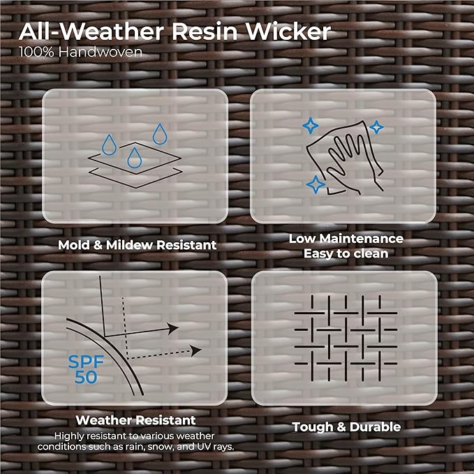 - Bistro Set with a Modern Farmhouse Vibe: Crafted with meticulous attention to detail, this patio bistro set is a seamless blend of rustic charm and contemporary design. It boasts all-weather resin wicker intricately handwoven around a sturdy e-coated steel frame, ensuring both durability and elegance.