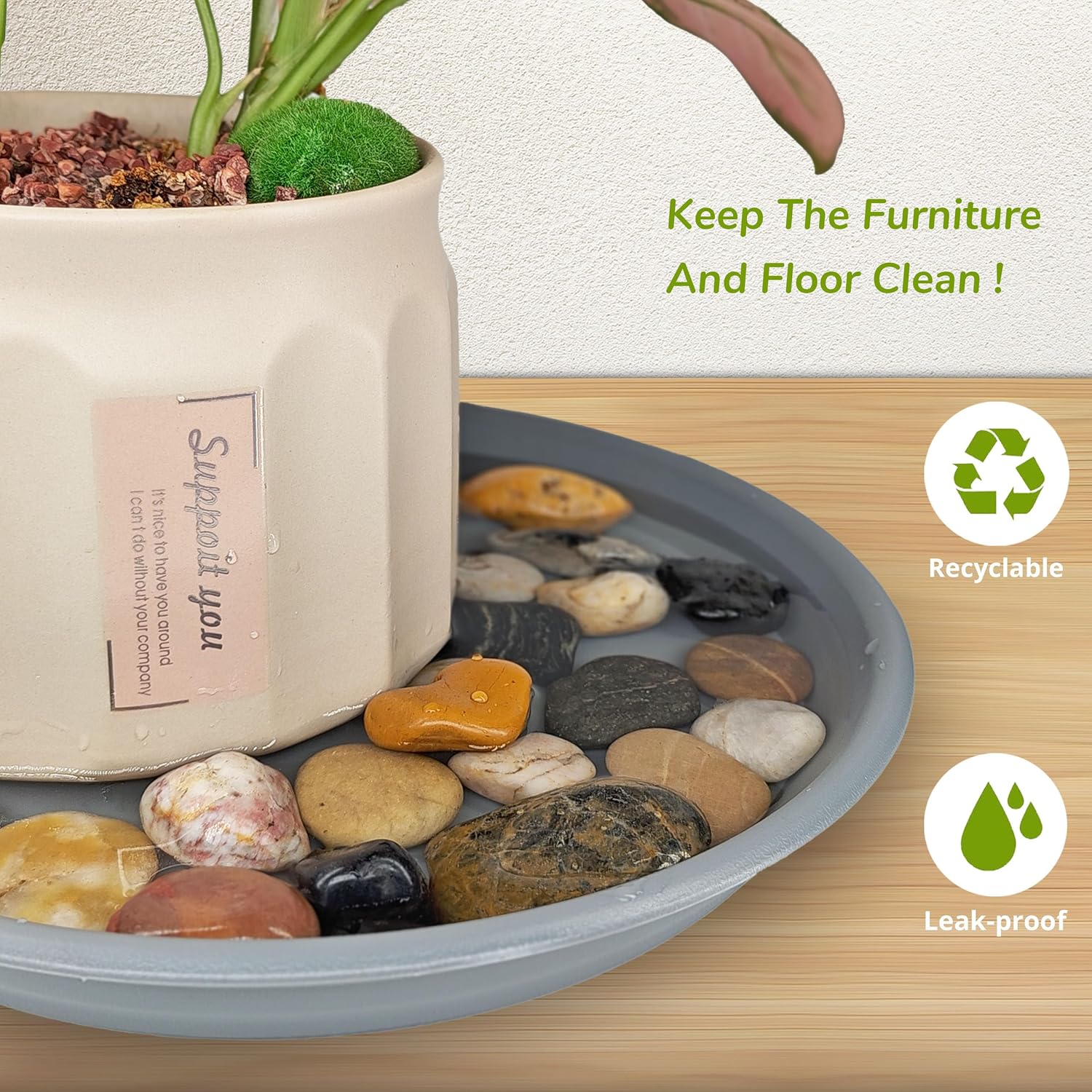 - Optimal Plant Drainage: These plant pot saucers help you catch water from the plant pot drainage hole. help protect wooden floors, carpets, and tabletops from water drainage and soil spillage. You can decorate the plant drip tray with colorful pebbles