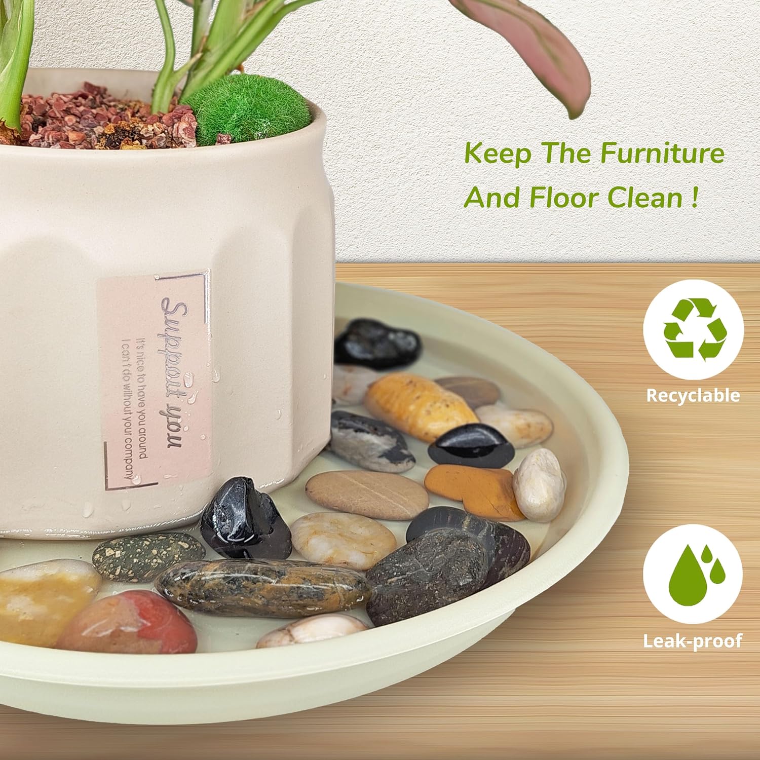 - Optimal Plant Drainage: These plant pot saucers help you catch water from the plant pot drainage hole. help protect wooden floors, carpets, and tabletops from water drainage and soil spillage. You can decorate the plant drip tray with colorful pebbles