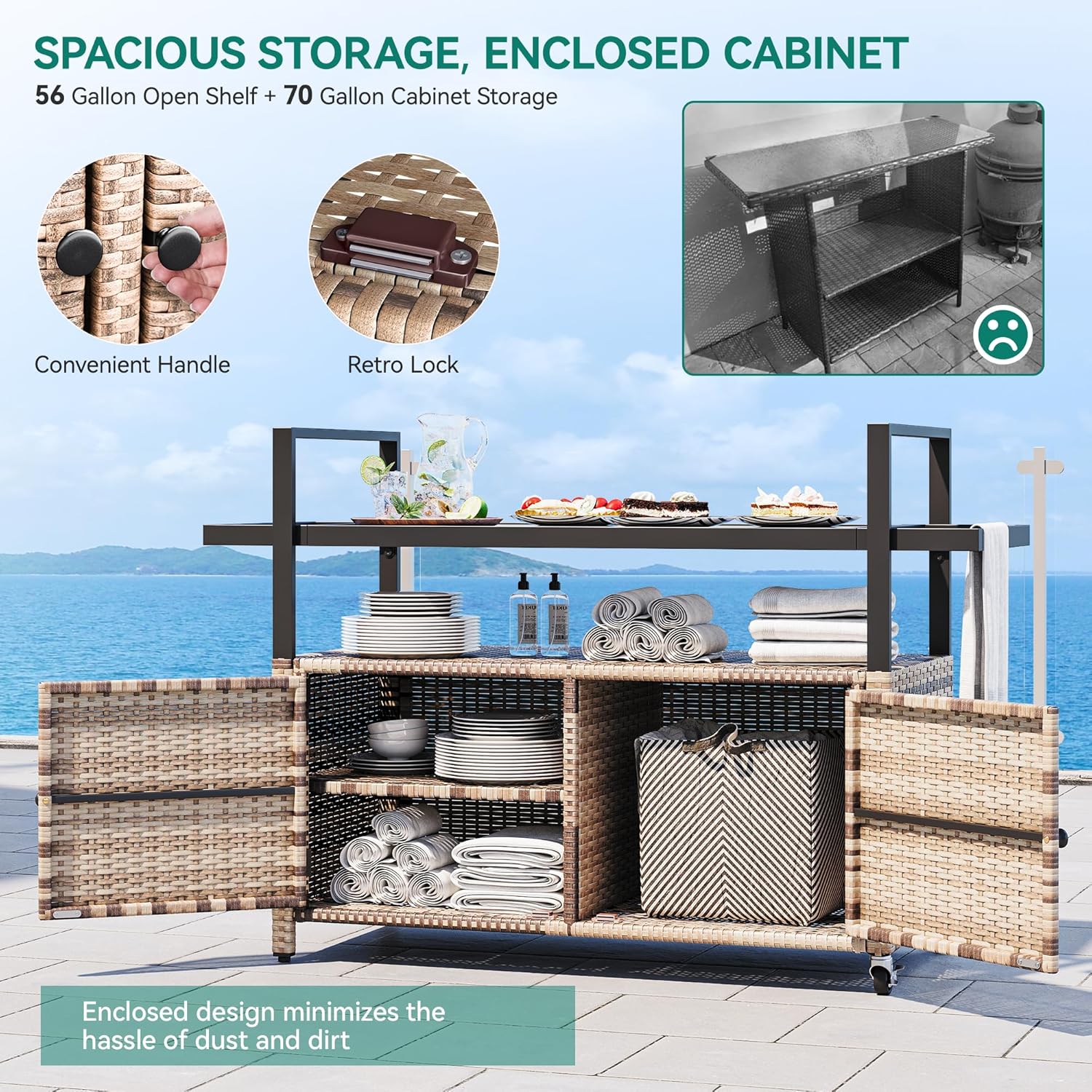 - Patented appearance: Our outdoor kitchen bar cart features an exclusive, patented design and offers spacious storage options; Enjoy a large 56-gallon open space, a 70-gallon cabinet