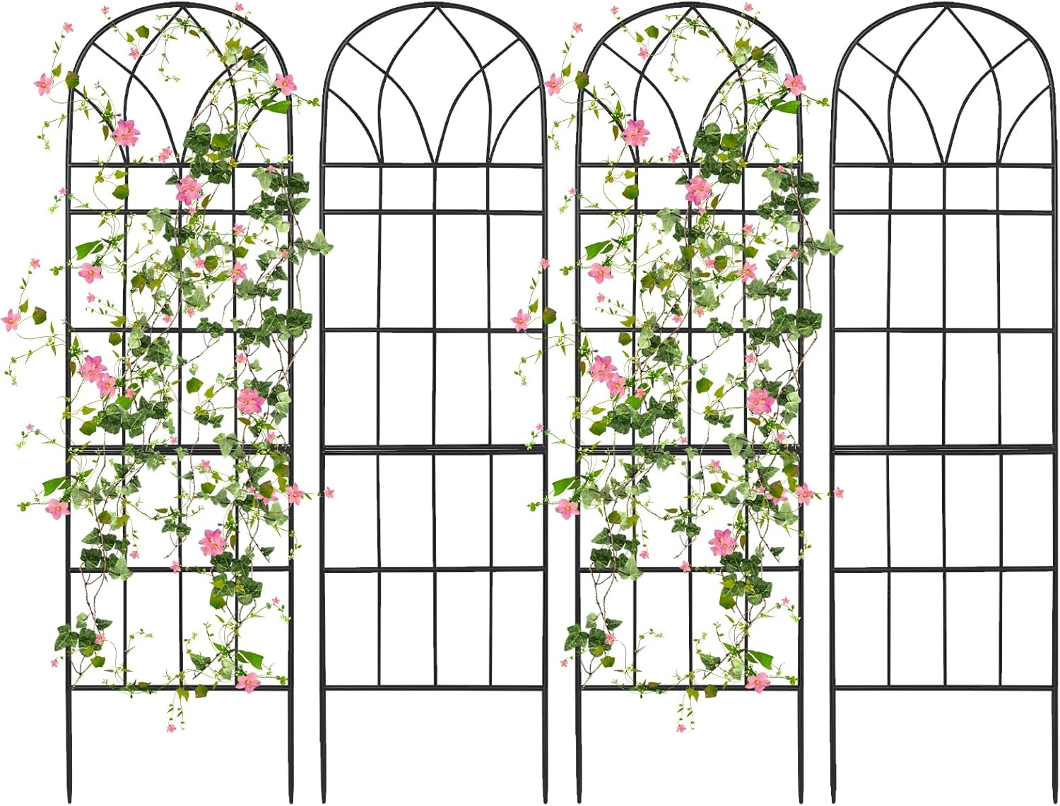 - Heavy Duty & Elegant Decor: Our tall vine trellis is welded with thickened metal steel, hand-painting black powder coating and weathered finish to make it can be used for years to come. Ideal for summer to support flowering vines, and in fall or winter.The vertical section with aesthetic design adds a stylish and elegant touch to your yard. Our decorative garden trellis for climbing plants outdoor comes in decorative patterns, adding interest and variety to your garden, balcony, yard, or patio