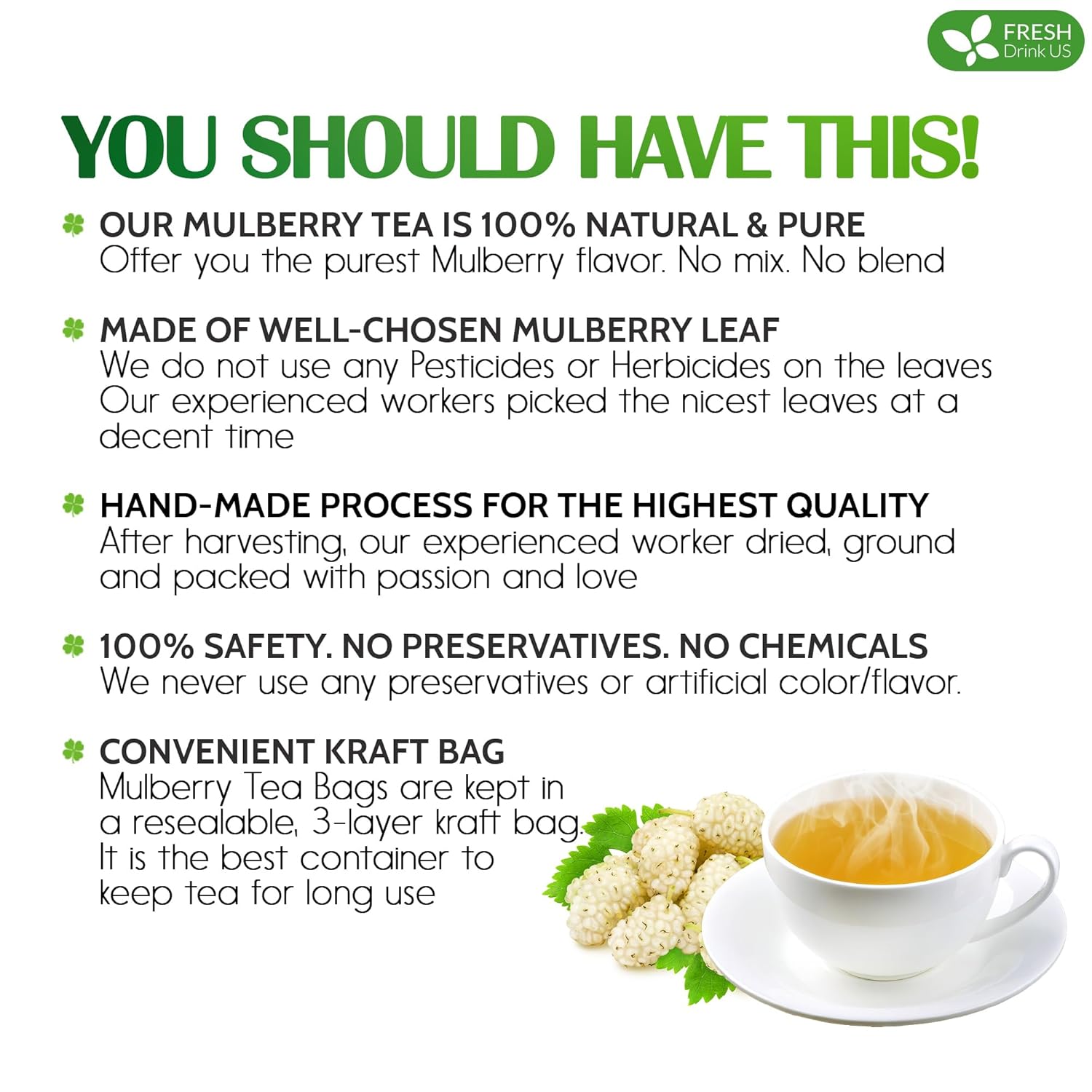 FreshDrinkUS Premium 120 Mulberry Leaf Tea Bags, 100% Natural & Pure. Loose Leaf Herbal Tea. Made with Natural Material Tea Bags. No Sugar, No Caffeine, No Gluten, Vegan