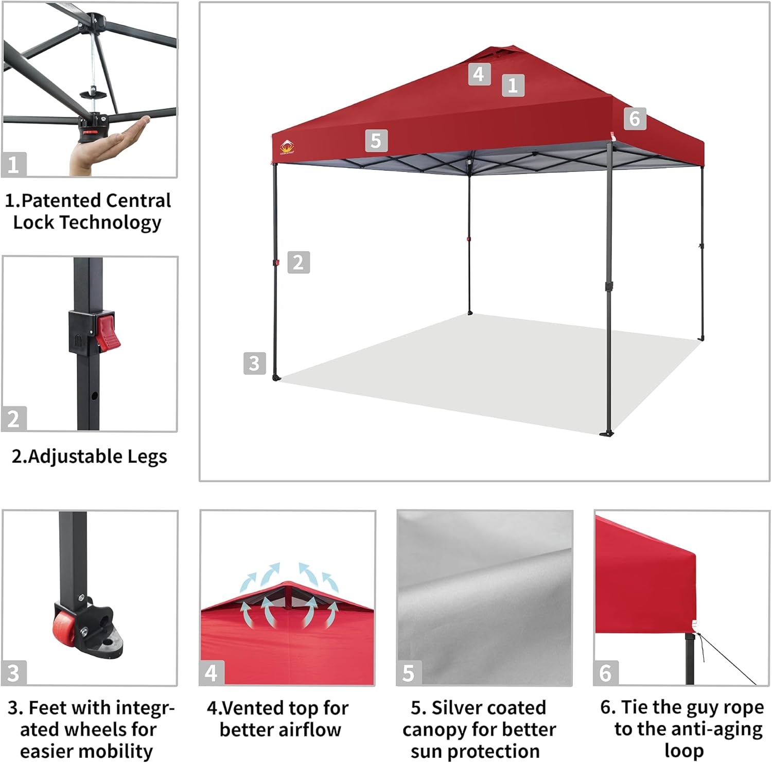 - ONE BUTTON EASY SET UP - Our 10x10 pop up canopy tent features patented one push center lock tech. With just a single push, the central hub locks the poles in place. Designed for the next generation, this outdoor canopy for patio can be set up by two people in seconds without any tools. Three adjustable height settings with soft, pinch-free buttons ensure convenience and safety, making it perfect for camping, beach outings, craft fairs, tailgating, farmer markets, outdoor BBQs, and more.