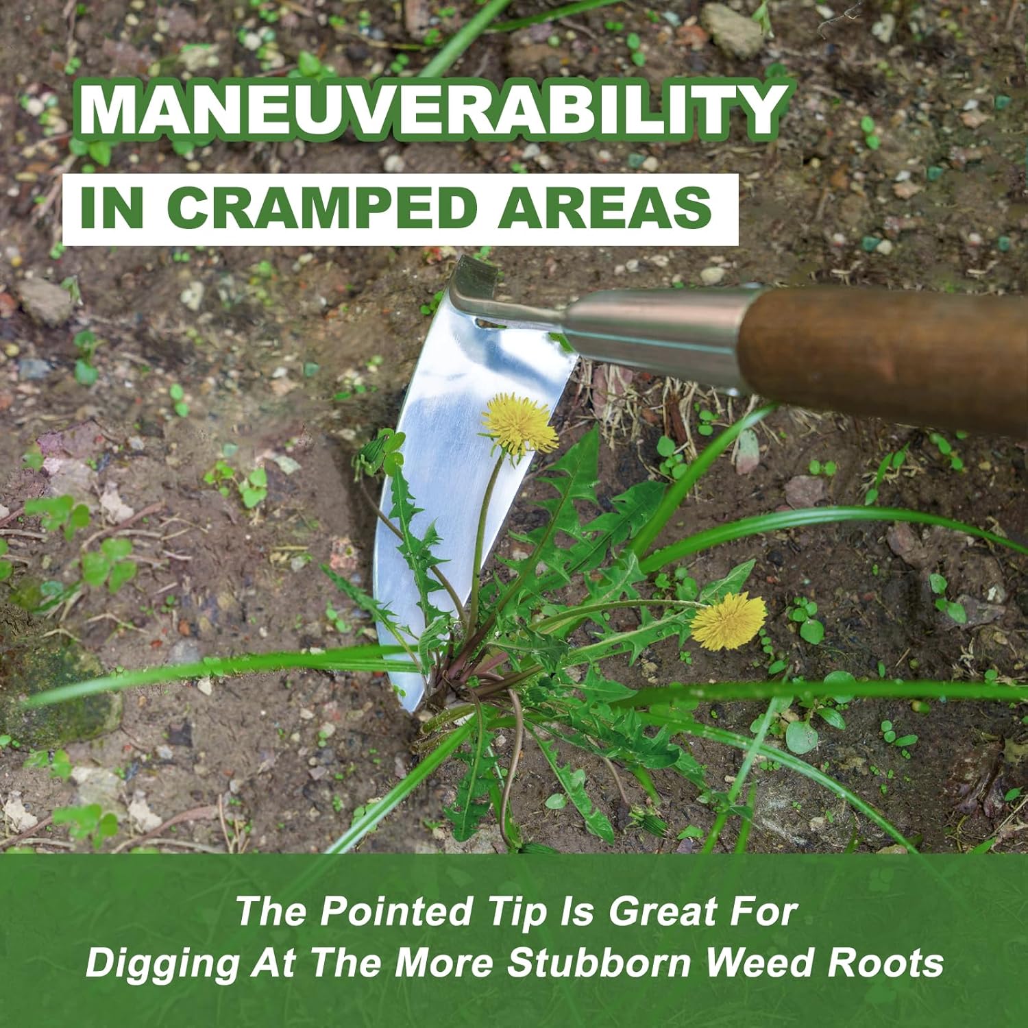 - 【Special Elbow Design】The gardening sickle hoe has a special elbow design, which makes it so much easier to clear the weeds. The unique angle design makes it easy for the hoe to quickly scrape shallow weeds with a sharp flat blade, and a sharp tip allows you to easily chop deep to get to roots.